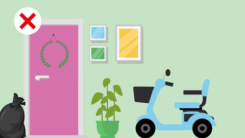 - Haal hindernissen op de vluchtroutes weg en zorg dat die wegblijven. Denk aan losse kabels, meubels, plantenbakken of kleedjes. En aan alles waar je in het donker tegenaan kunt lopen of over kunt vallen.