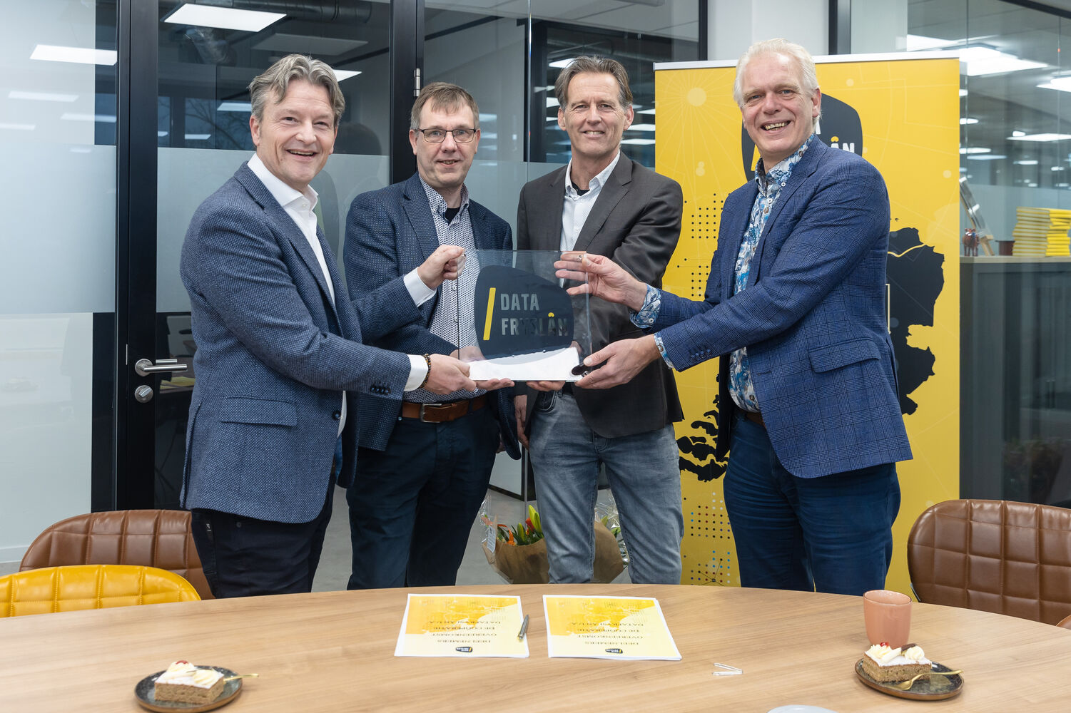 Op de foto: Peter van de Weg (Elkien), Roel Vuursteen (Elkien), Edwin Elfrink (Datafryslân) en Eelke de Jong (gemeente Leeuwarden)